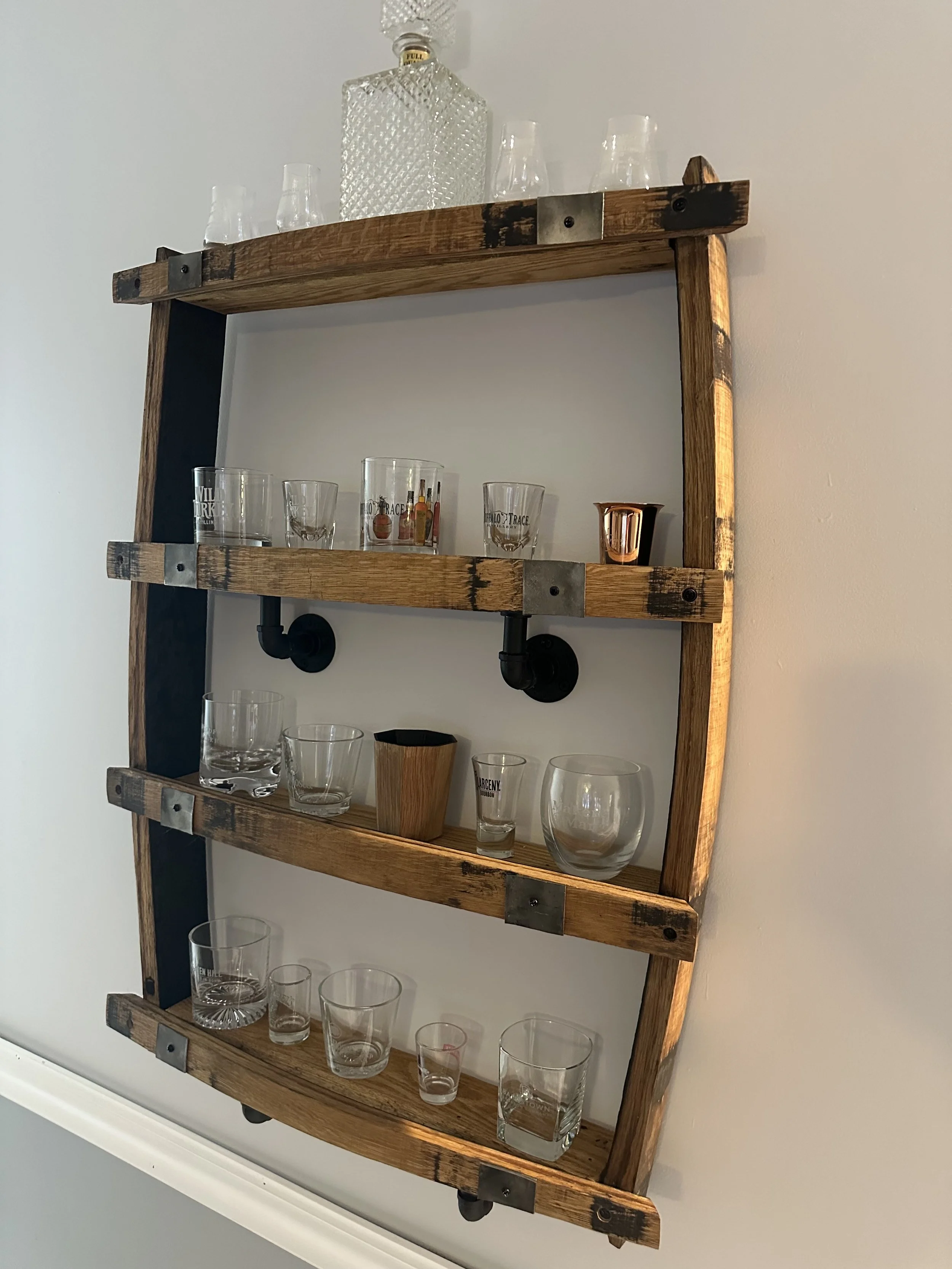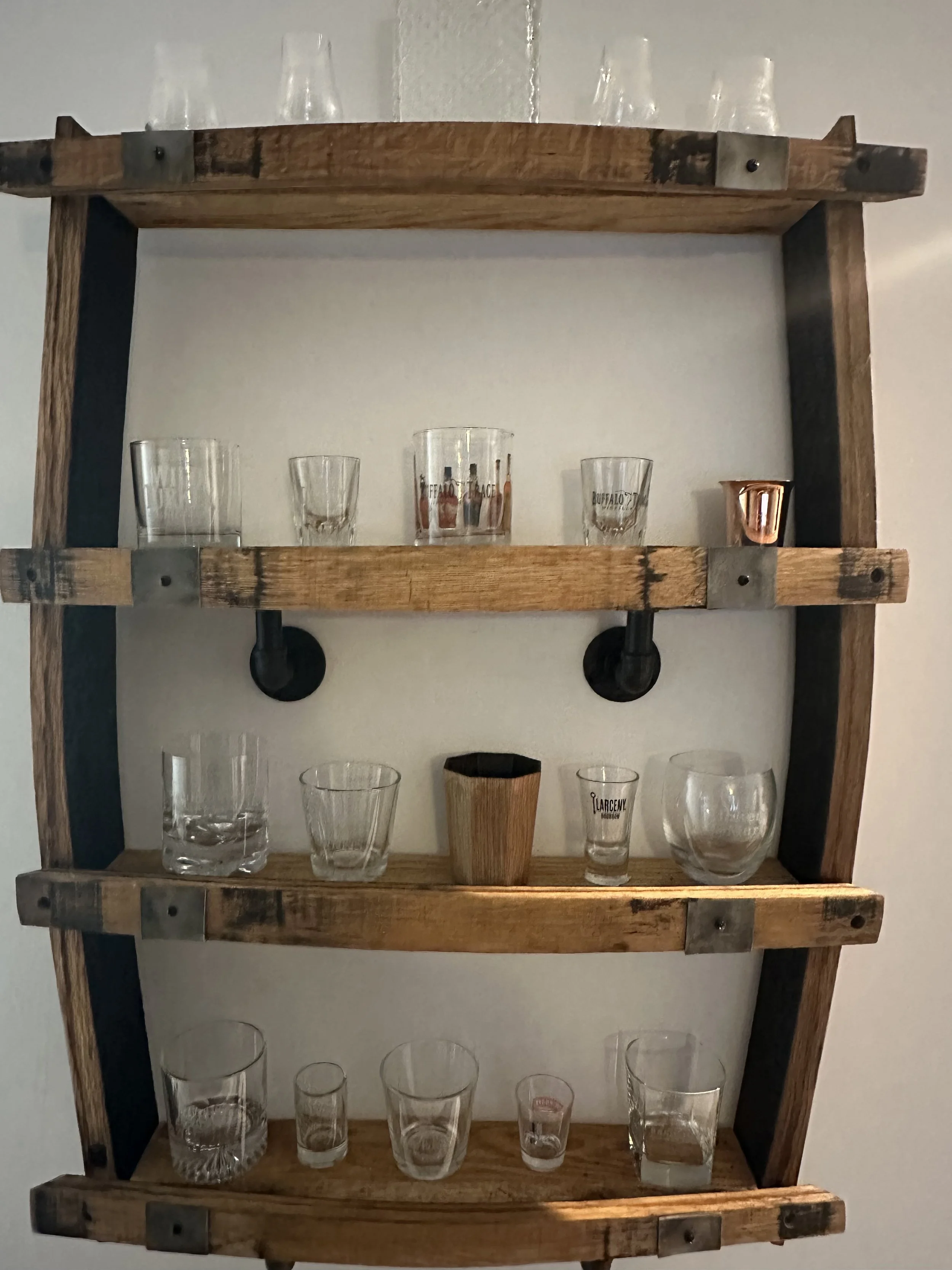 The Distillers Display brings rickhouse elegance to smaller walls with tiered shelving framed by reclaimed barrel rings. Whether mounted in a kitchen, tasting room, or office, it’s designed to elevate your favorite bottles or glassware with purpose and style.